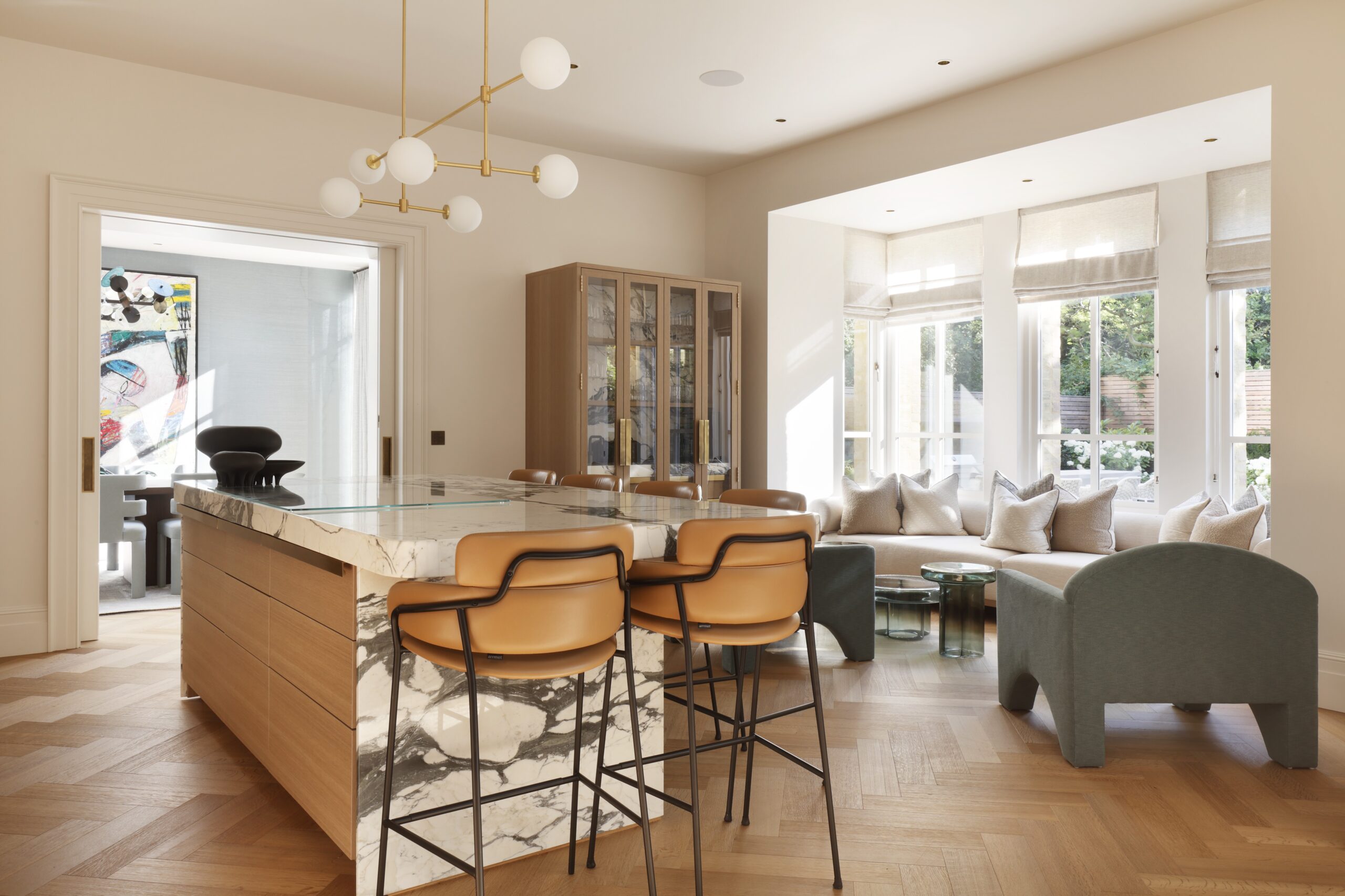 The article titled, ‘The Emerald and Jade Tones In This London Home Make Us Green With Envy’, delves into how the colour green connects each room in this house. Entering into this London kitchen, you are greeted by an impressive Calacatta marble island with matching countertops and backsplashes. The marble is paired with grand oak cabinetry and brass detailing to create an elegant space, perfectly in tune with the client’s tastes.