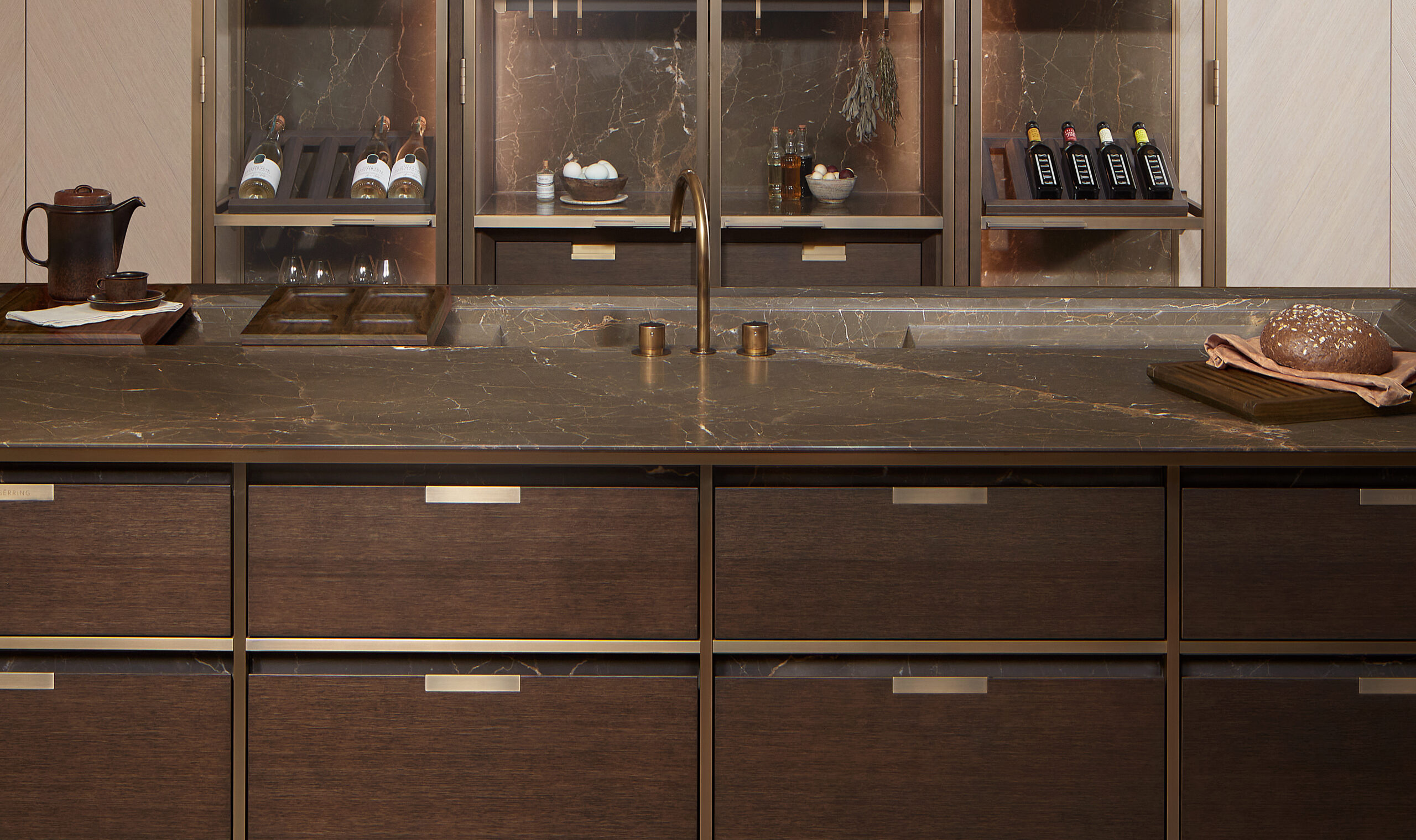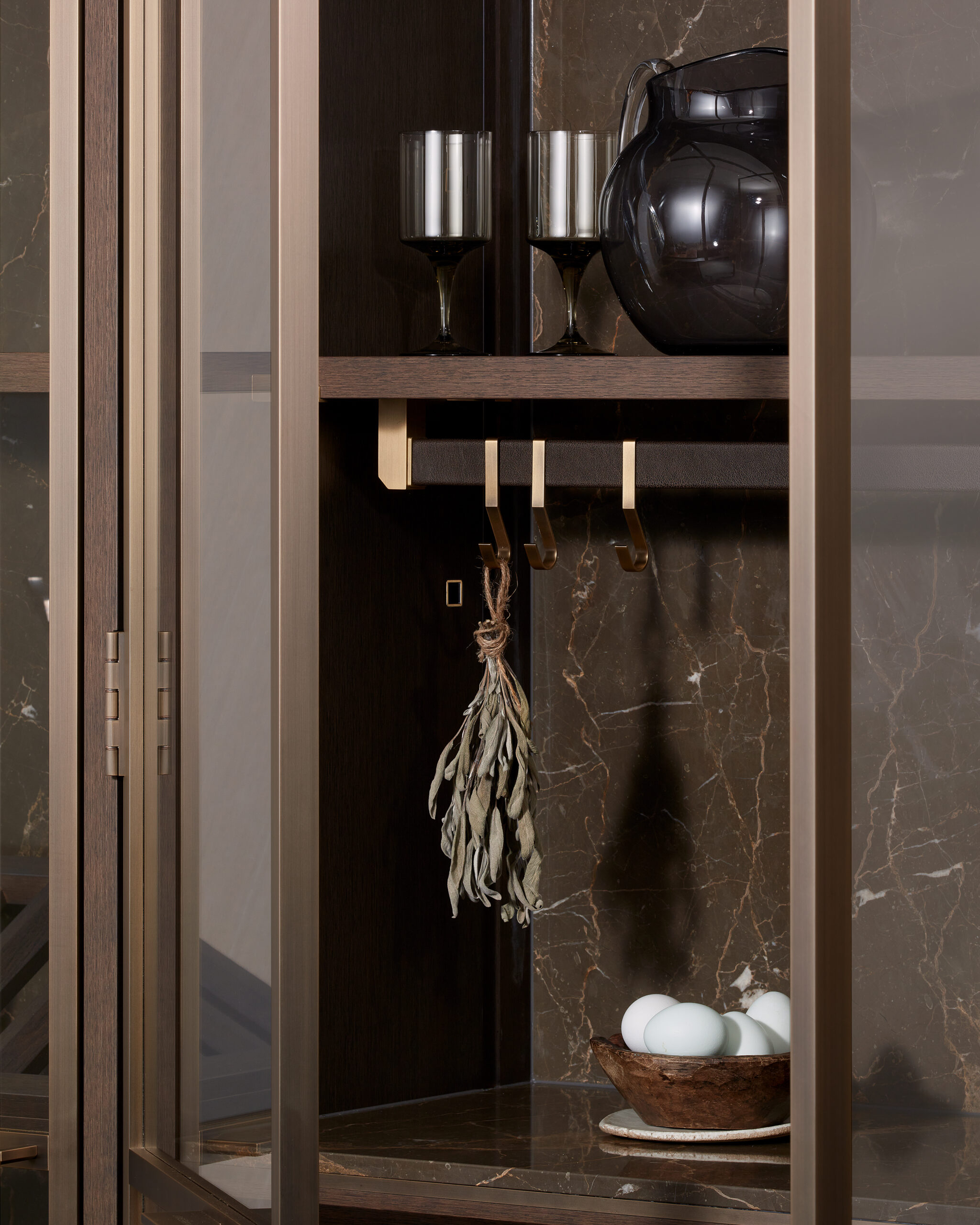 Bronze hooks in the London showroom – these custom hooks can be removed, rearranged and added to create a totally personalised experience. These bronze details provide an ease of use for practical utensils and create a space to present decorative items to elevate and style the kitchen. This concept was also used in the recently revealed kitchen garden at Waverley House.  They represent a marriage of elegance and functionalism which embodies Lanserring values.