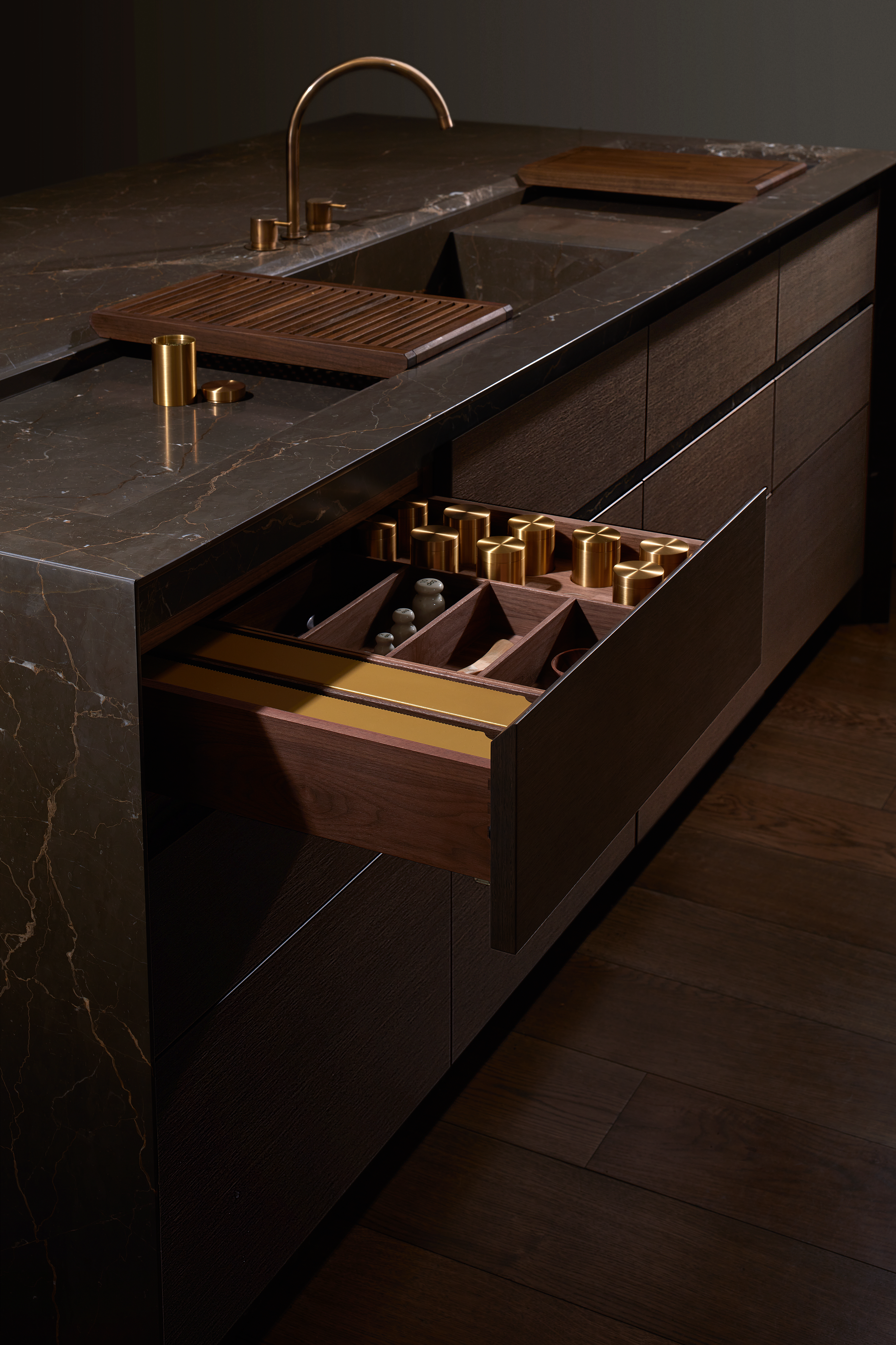Our handles are carefully crafted to complement the visual experience of each bespoke kitchen and also chosen for comfort of use. The handles facilitate an opening movement that feels intentional and luxurious. The cabinets of our London and New York showrooms present the enhanced beauty of a metal handle when complemented by a glass panel.