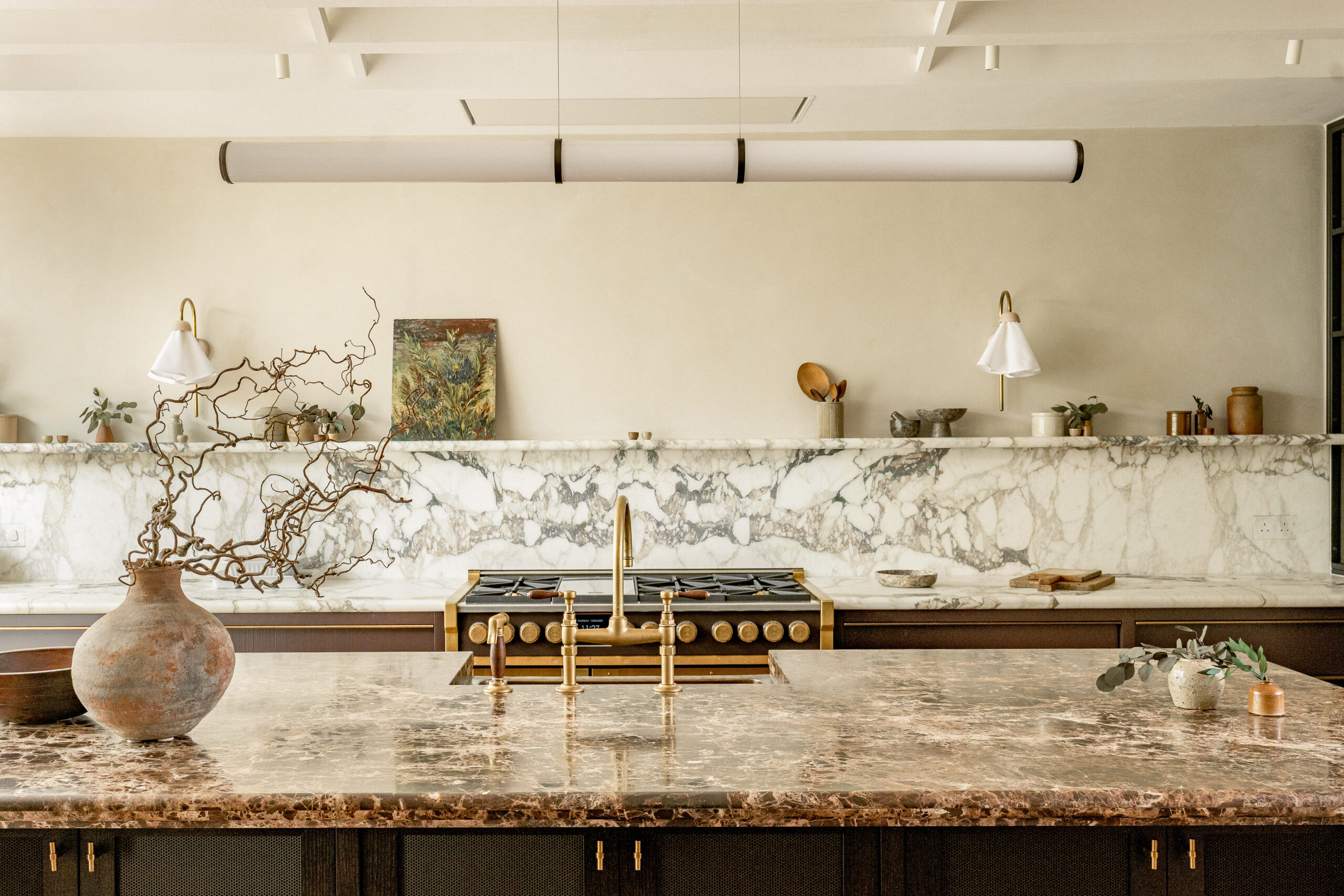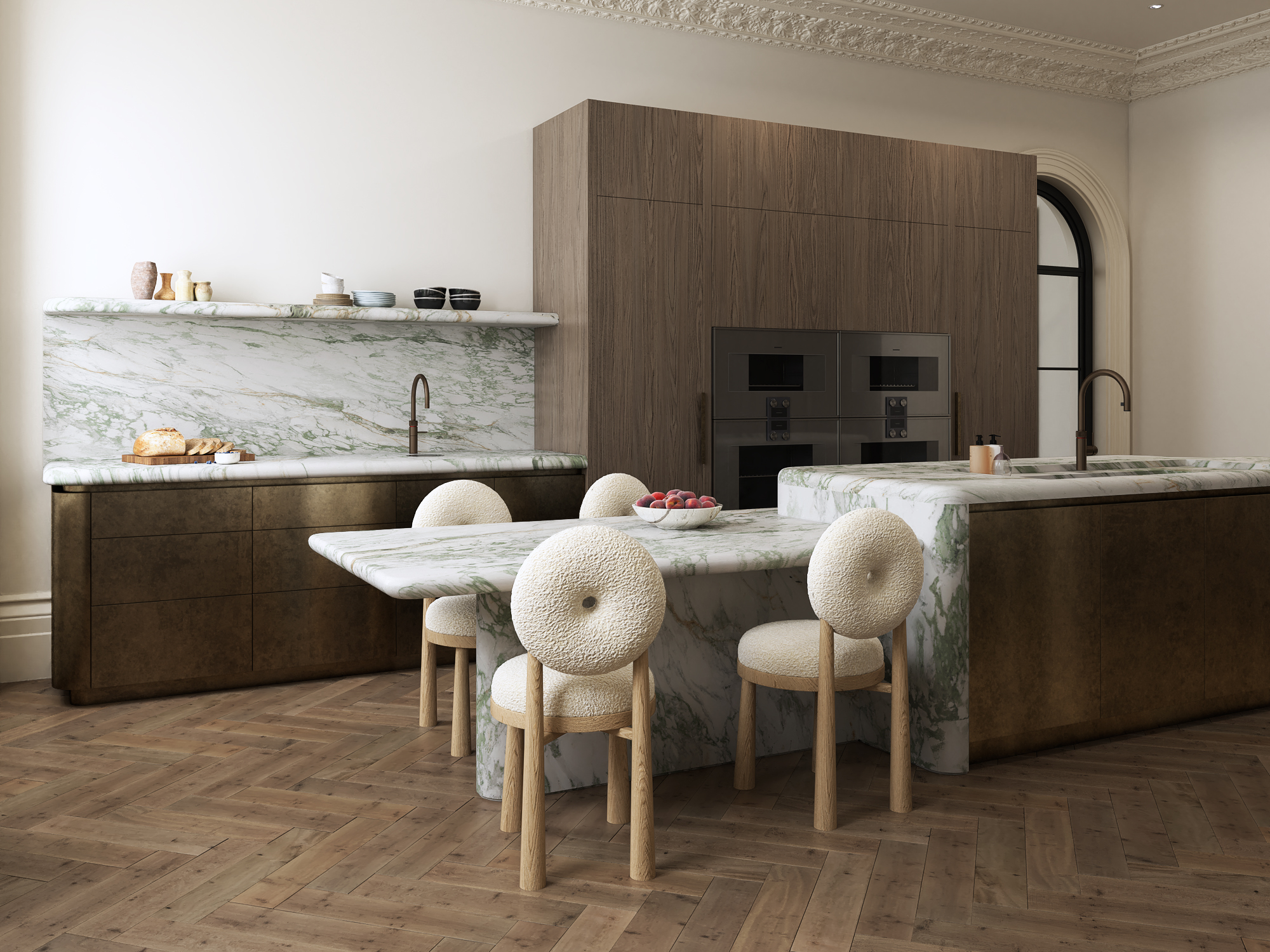 At the Kensington Villa, Calacatta Paonazzo worktops take centre stage. The bold, smoky grey veining is a striking accompaniment to the fluted oak detailing. This marble forms a durable surface for the worktop and backsplashes, perfect to accommodate busy family life. The clean and crisp kitchen palette adds a beautiful backdrop for hosting. White oak veneer cabinetry and pantry units elongate the white background of the marble up into the cream walls.