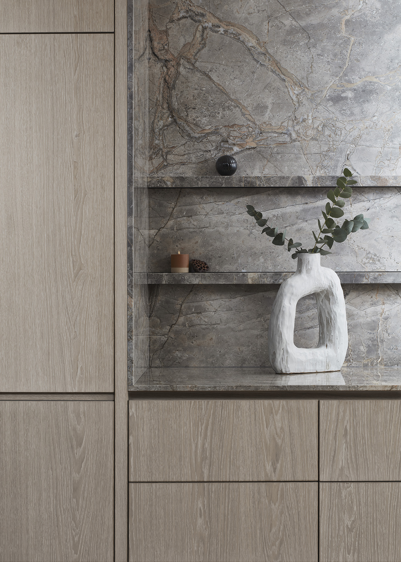 In the design process we think about; the angle of the handhold on a marble drawer to the millimetre, the lighting that is set in to a small cut-out in the stone, the seams that are designed to blend into the materials and sculpted forms.
