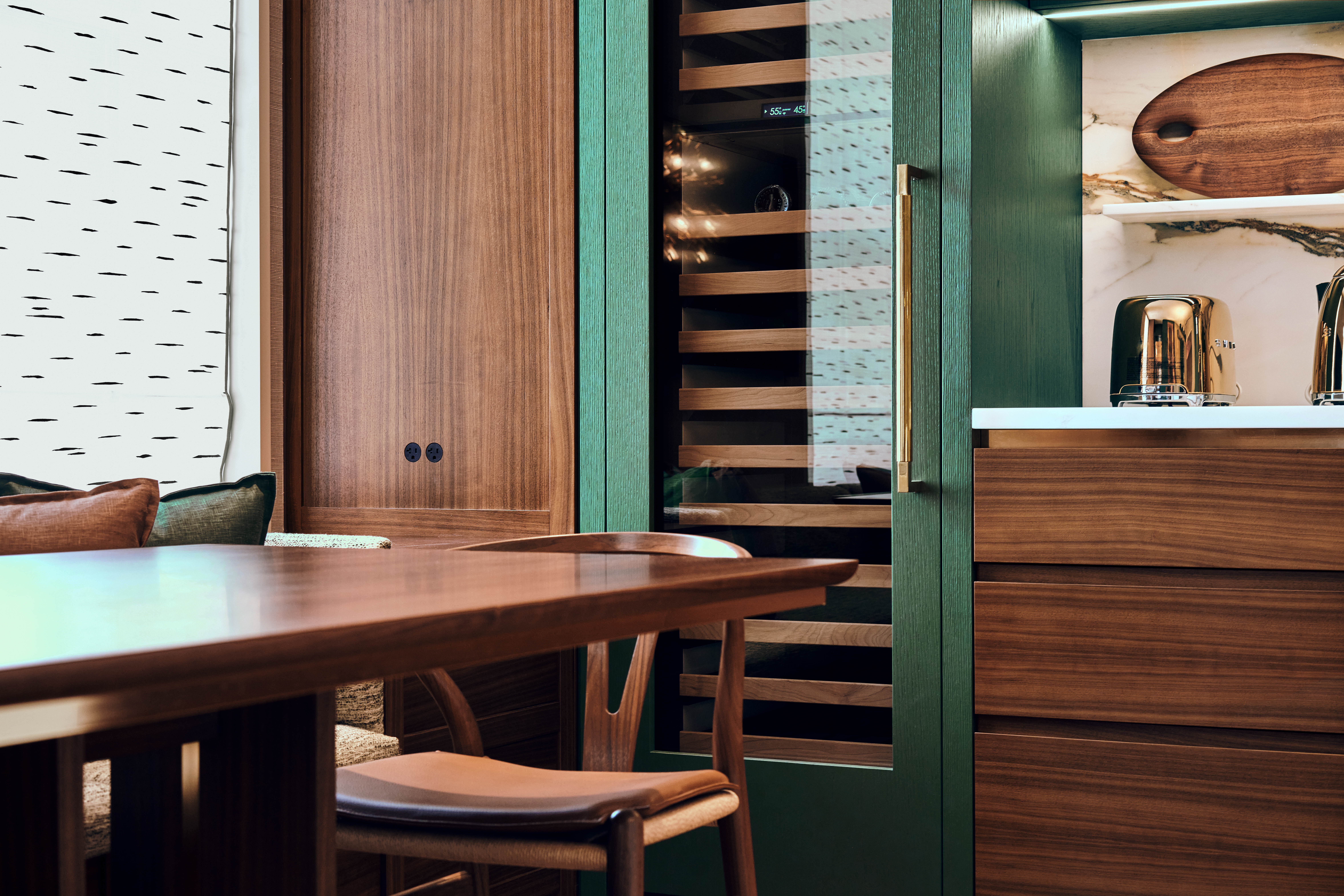 Deeper woods can be tastefully paired with marine grade-bronze, green veined marble, and warm ambient lighting to knit together a grounded interior experience. This has an atmospheric effect on the space. Hand-finished patinas give a touch of the unique to the materials, translating into the overall aim to curate a tailored kitchen where every detail is considered.