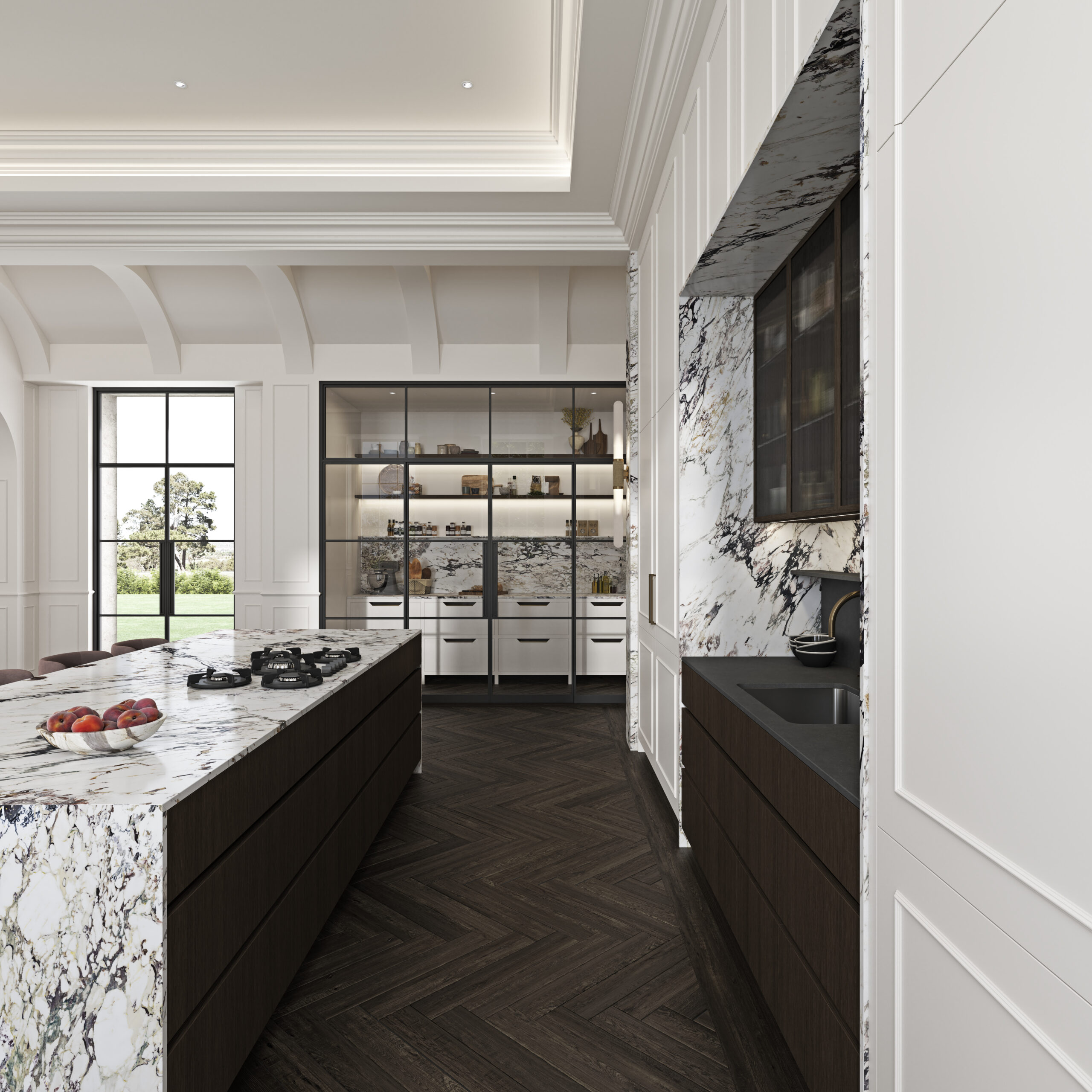 A beautiful kitchen design project that has come out of a design-led process is the refined Cheshire House conceptualised in collaboration with Studio Havn. Our team conceived a space that feels warm, welcoming and elegant. The generous island houses bespoke drawers and is enriched with a resplendent Macchia Vecchia marble surface.