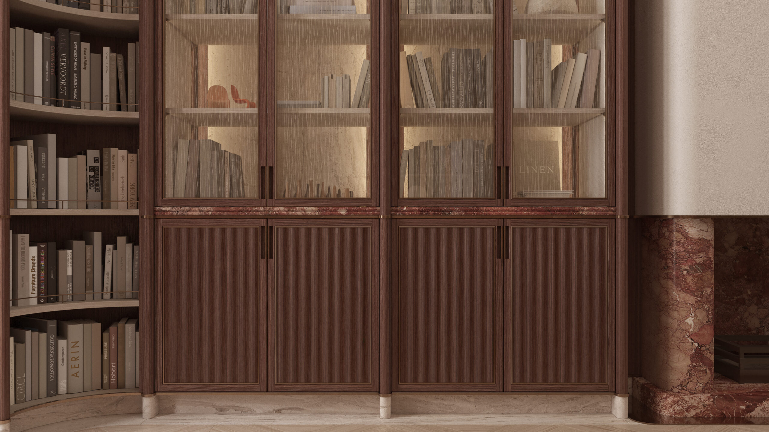 Appearing on multiple surfaces and details, the whole room glows with a blushed warmth that creates the perfect welcoming atmosphere. As you enter the entertainment space the rippled glass reflects the red tones onto the mirrored shelving unit. Once at the centre of the room the drinks cabinet takes centre stage. The Breecia Pernice marble enhances this social corner subtlety linking to the materiality we find in the The Garden.