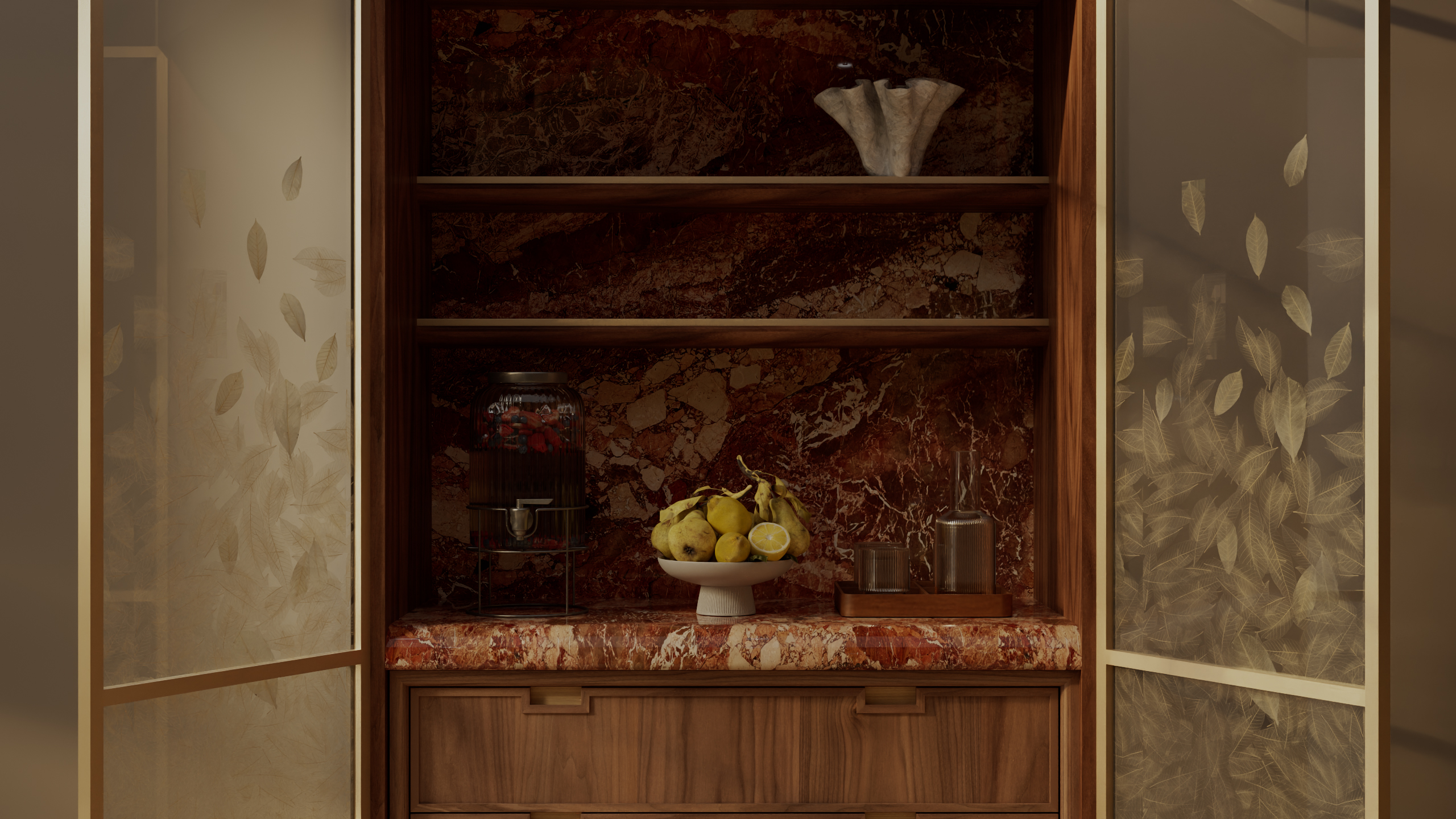 The drinks cabinet in the garden is first seen behind the organic pressed leaf surface and adjacent to walnut drawers. This symphony of materials orchestrates the perfect corner to pour yourself a drink and take a moment to enjoy the craftsmanship of the design.