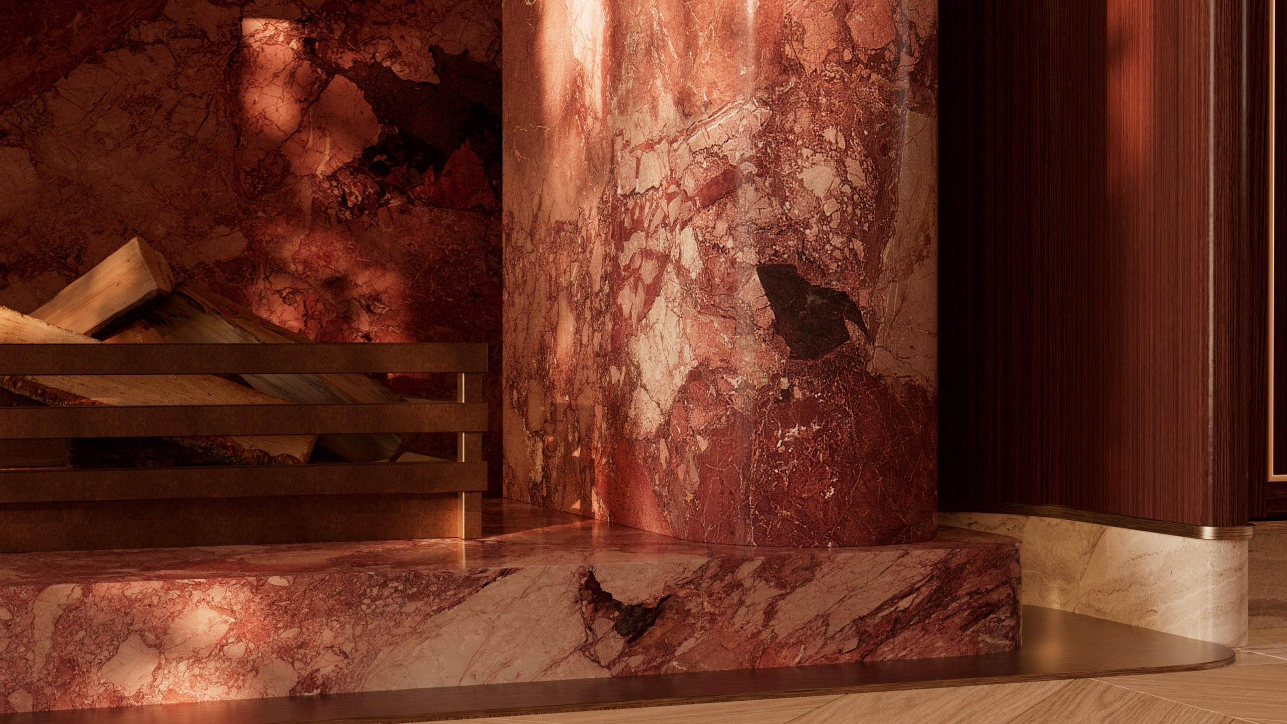 This indulgent marble is enhanced throughout by our designers’ tasteful pairings of the material with walnut, glass and red stained oak.