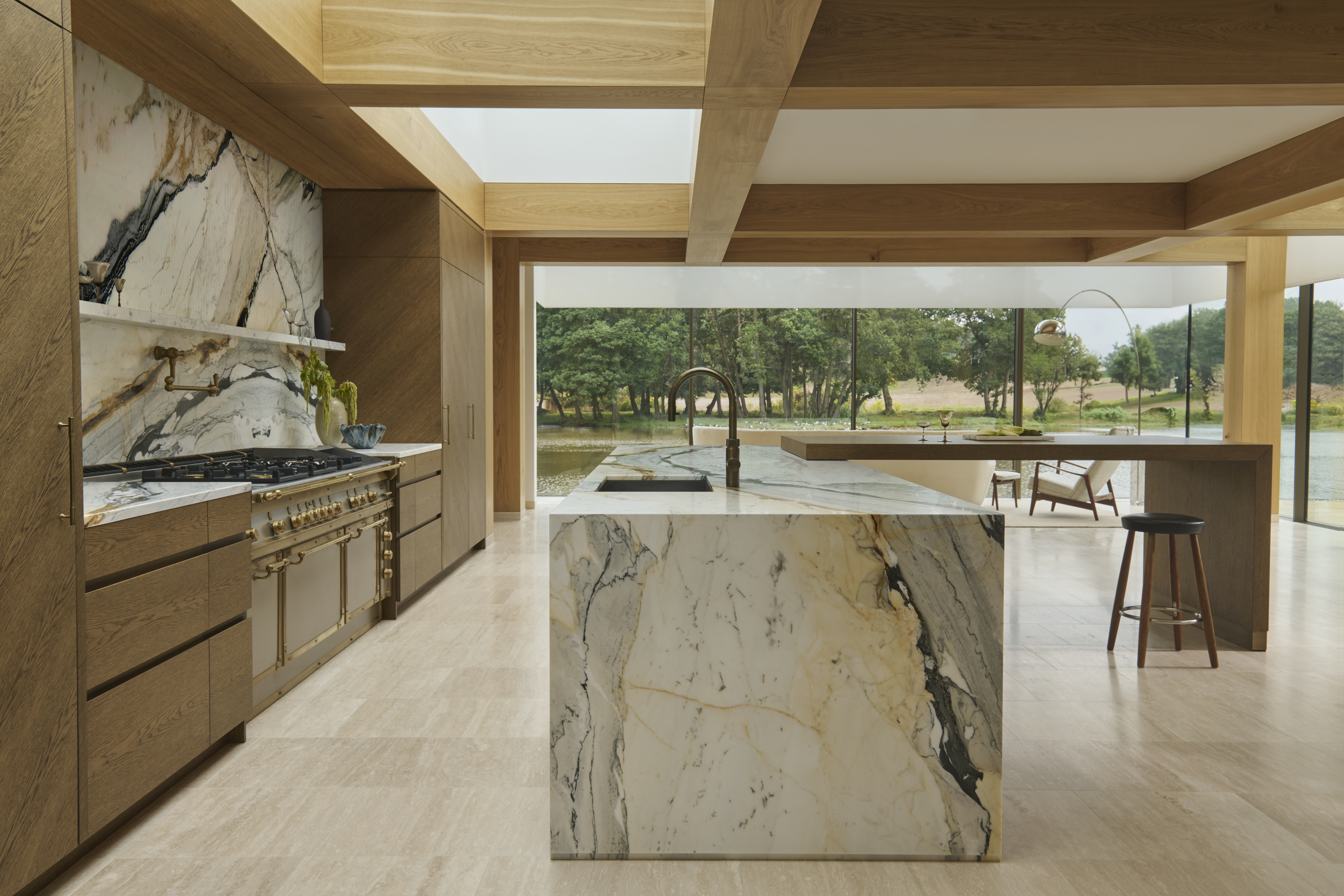 A beautiful example of a marble slab that was carefully selected by the client is the stone for the island at Cheshire House. This Macchia Vecchia Marble is a stunning combination of hazel, grey and white with an elegantly distinctive veining composition. The worktop stone is paired with solid oak joinery which echoes the oak tones, creating a cohesive kitchen. Refined brass accents balance this design with an alternative texture and deeper colour.