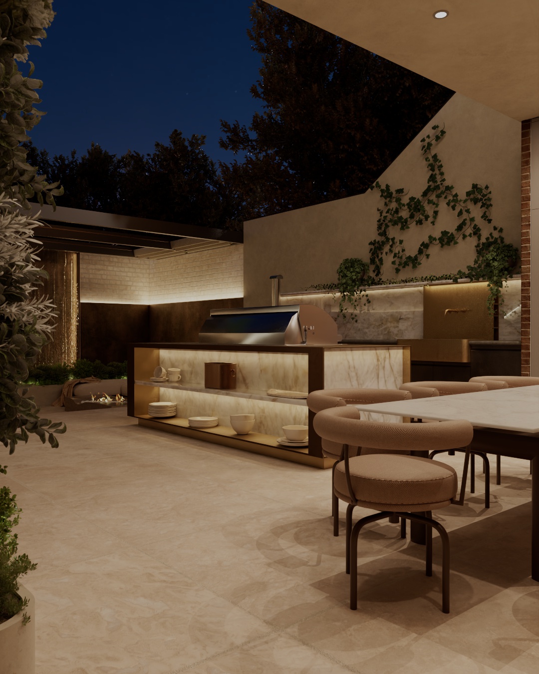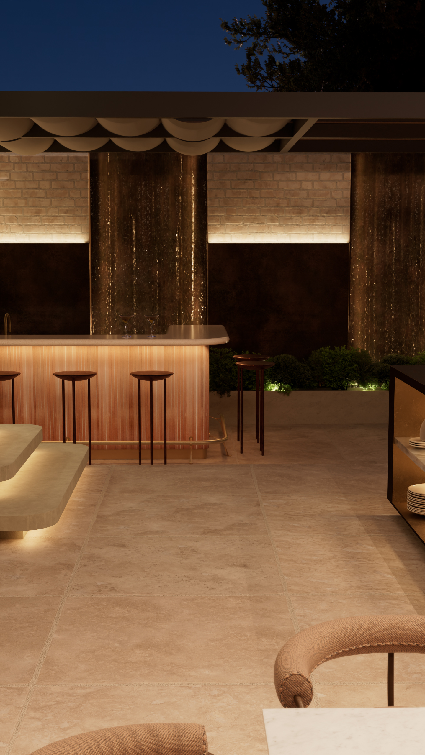 The experience of hosting flourishes in this outdoor kitchen, optimised for multifaceted moments that create a sense of fulfilment. The kitchen is divided up into zones designed for particular purposes; cooking, socialising, taking time to pour a drink and quiet moments for enjoying the atmosphere. The bar island and the end of the garden enhances a social evening with friends – the L shape is a considered detail to naturally bring people together.
