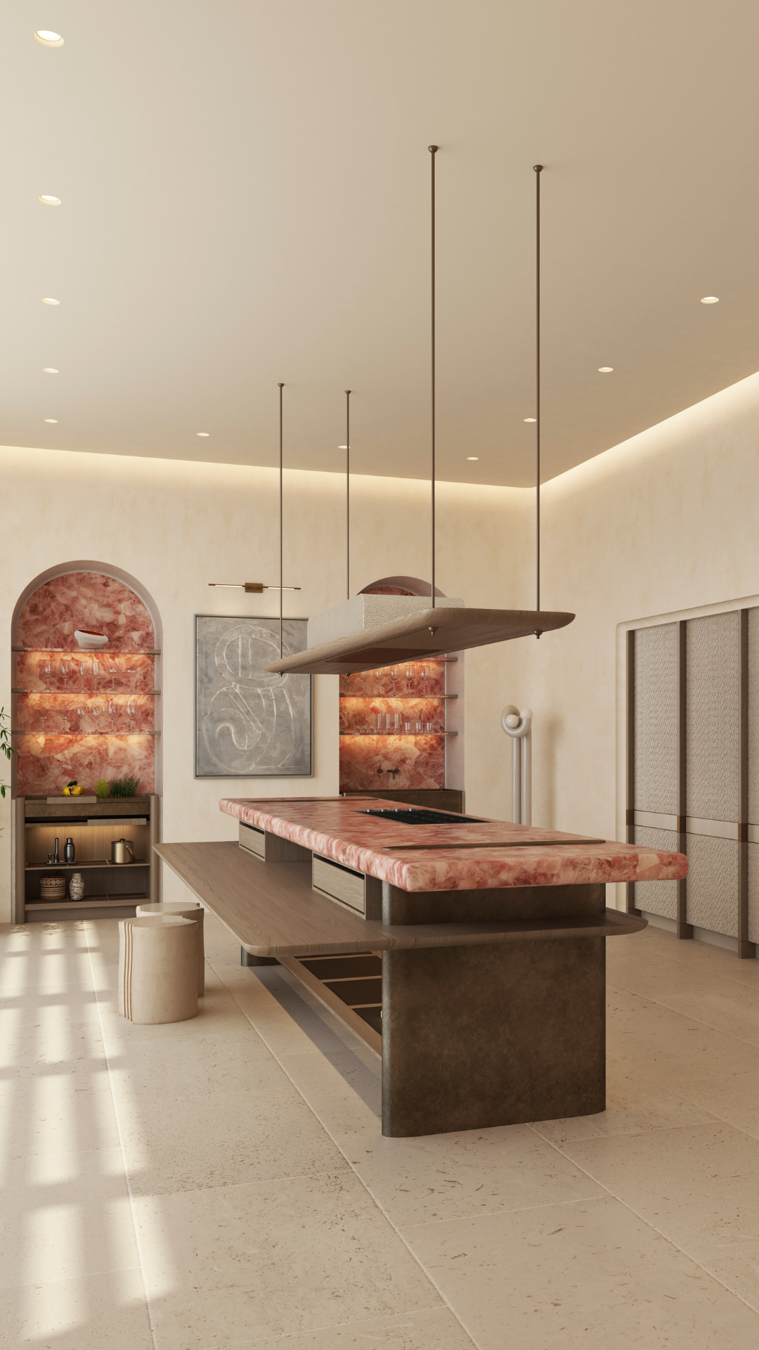 The kitchen at the heart of The Rose Villa invites the beautiful outdoor scenery inside, curating a serene atmosphere that invites you to relax and unwind. Guests enter through a decadent archway that leads them to the kitchen-living area. The colour palette has been thoughtfully developed to evoke a sense of calm using natural materials such as bamboo.
