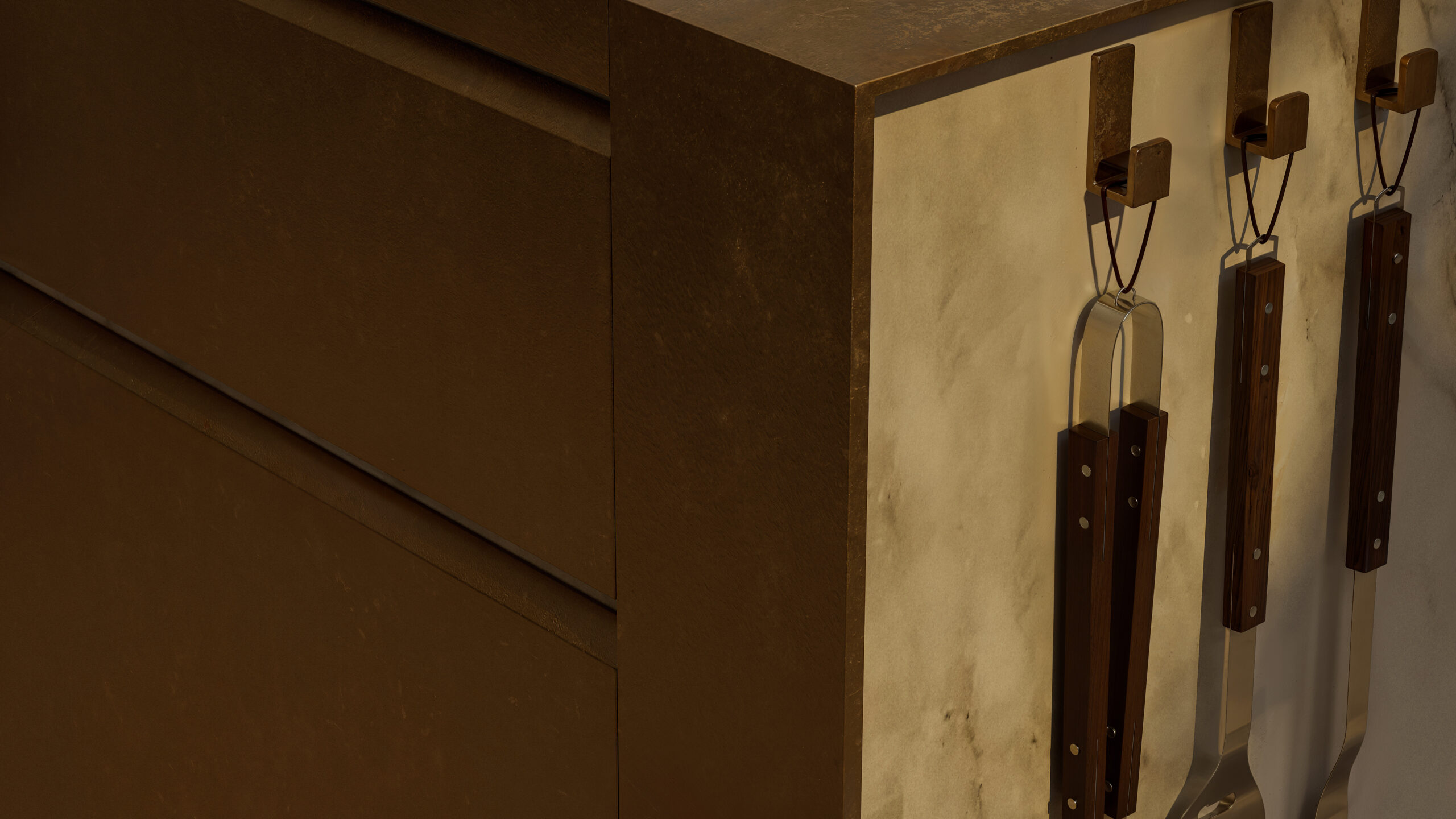 Opposite, the main island commands attention. Constructed from Cristallo Quartzite and elegantly wrapped in natural bronze, the island is built to age gracefully, developing a unique character with time. It houses a professional-grade BBQ and dual retractable flaps with integrated LED lighting, providing protection for the surfaces below while extending usability into the evening hours. Inside, generous drawers lined in oiled black walnut offer both resilience and warmth: a natural material used sparingly but purposefully to bring Lanserring’s indoor craftsmanship outdoors. Bespoke chopping boards, each designated for meats or fresh herbs, are concealed within. On either end of the island, bronze recessed niches with custom hooks hold cooking tools, while the rear transforms into a buffet-style serving area for effortless entertaining.
