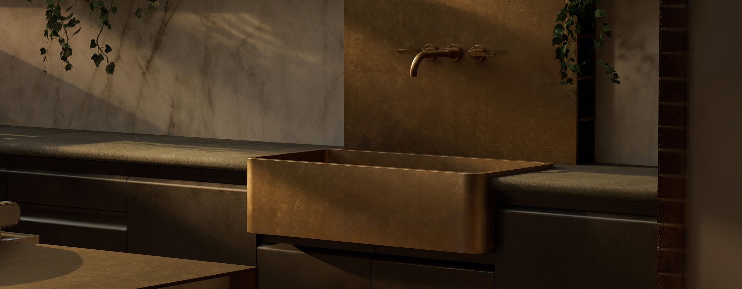 The sink run features a custom metal sink, crafted from marine-grade bronze: a material more commonly found in nautical applications, selected here for its strength and evolving patina. The worktop is flanked by an integrated pizza oven, and the entire run is clad in blackened stainless steel, chosen for its understated tone and natural durability, as well as brushed raw lava stone, whose textured surface offers a rich haptic experience.